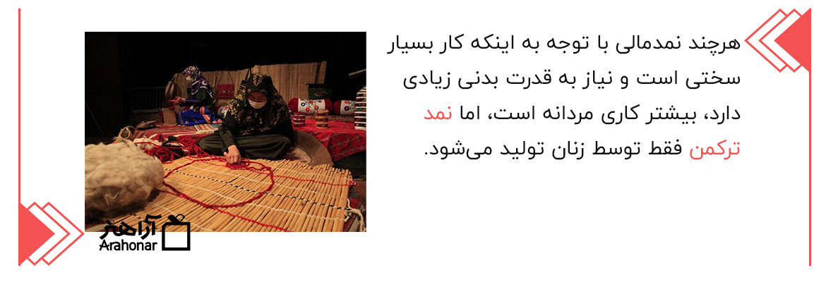 همانطور که عنوان شد نمدمالی در اکثر شهرها کاری مردانه است، به جز در شهرهای ترکمن نشین. نمد مالان در هنگام کار شعرهای متفاوتی را بر روی لب زمزمه میکنند تا همیت و همبستگیشان در هنگام این کار سخت و دشوار بیشتر شود. نمدمال با عشق بسیار و با حرکات هماهنگ و موزون دست و پا و خواندن شعر خستگی از تن بیرون می کنند.