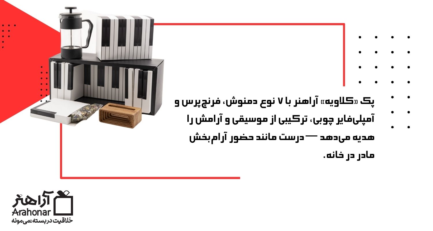 اگر مادرت به آرامش و لحظات دلنواز اهمیت میدهد، یک پک شامل شمع معطر، دمنوشهای گیاهی در فنجان سفالی میتواند بهترین کادو شب یلدا برای مادر باشد. بهعنوان گزینهای مدرنتر، پک «کلاویه» آراهنر ترکیبی از آرامش و موسیقی است؛ این پک شامل ۷ نوع دمنوش آرامشبخش، یک فرنچپرس و یک پایه نگهدارنده گوشی همراه به شکل آمپلیفایر چوبی است که تجربه نوشیدن دمنوش در کنار موسیقی دلنشین را برای مادر عزیزتان فراهم میکند و نشان میدهد موسیقی و آرامش، دو عنصر مهم در زندگی انسانها هستند. درست مثل حضور آرامش بخش مادر در خانه!