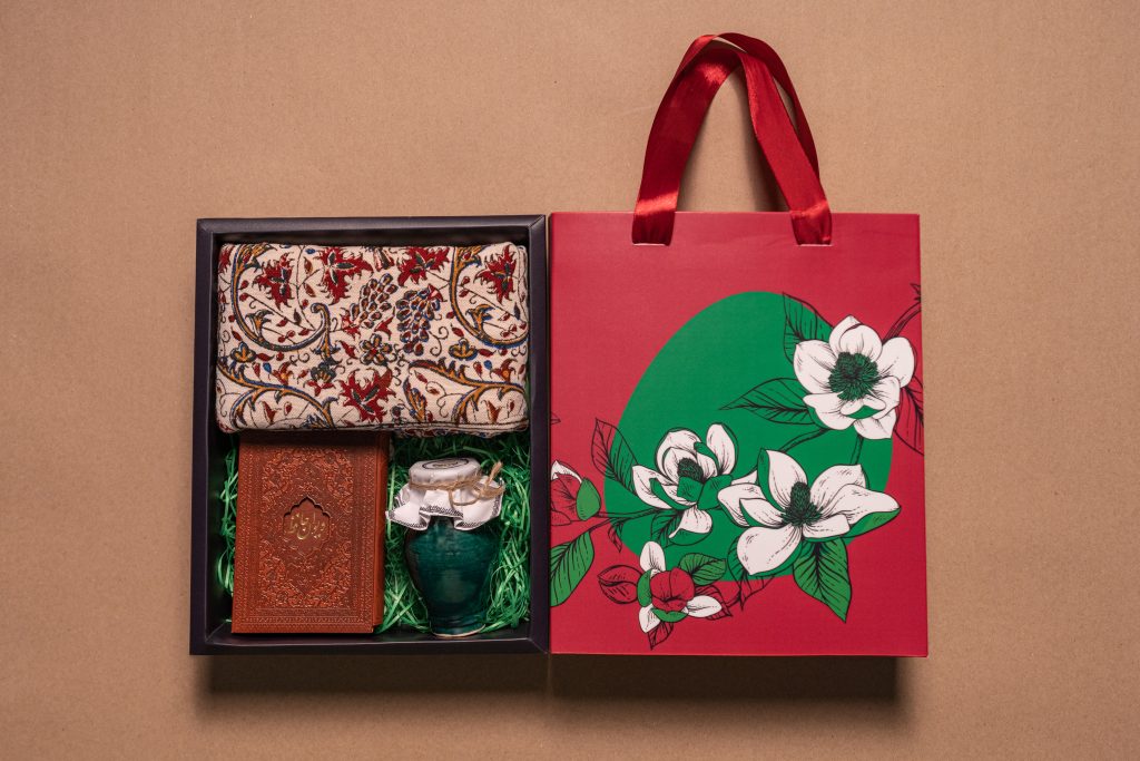 عیدانه نوروزی (بسته پارچه قلمکار و قرآن و کوزه حاوی گندم)