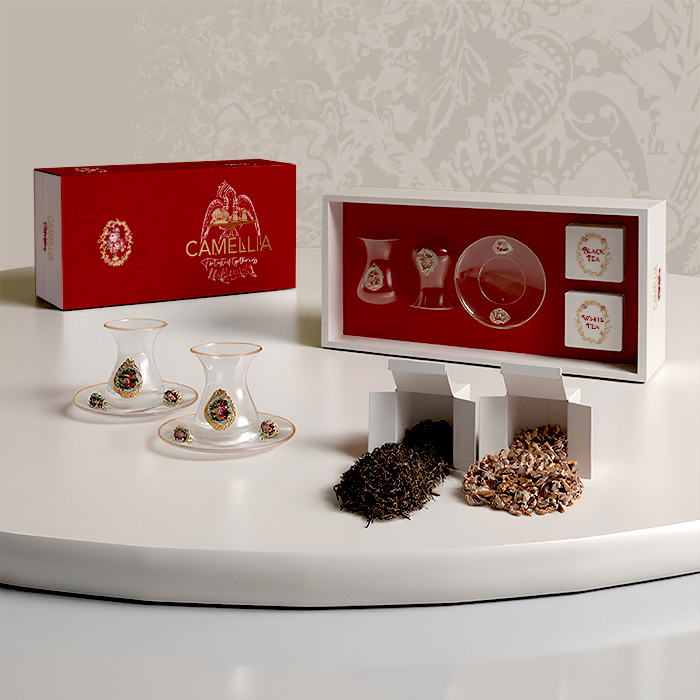 هدیه کاملیا قصهای از طعم و هنر ایرانی است؛ جایی که استکان و نعلبکیهای برجسته در بستهبندی خلاقانه کنار چای خوشعطر و چیپس خرما مینشینند. هدیهای اصیل برای یلدایی شیرین و پذیرایی دلنشین.