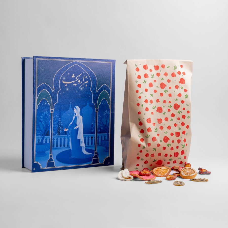 اقلام داخل بسته: کتاب با داستان کوتاه + میوههای خشک (آجیل شب یلدا)